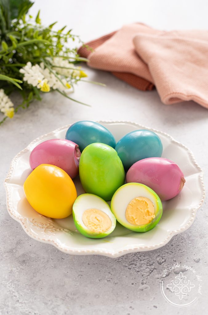 Hard-boiled eggs colored naturally can be obtained by immersing already peeled eggs in dyes made from vegetables such as red cabbage, beetroot, spinach or turmeric, which allow you to obtain delicate shades without using artificial dyes. This way you can prepare edible colored eggs, perfect to serve as an appetizer during the holidays or to enrich the Easter menu with a creative, natural touch.