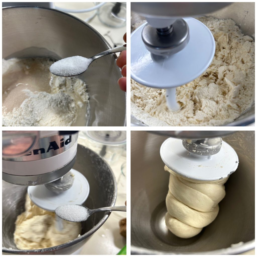 Add the lard and continue working the dough until it begins to come together. Then add the sugar and shortly after the salt.