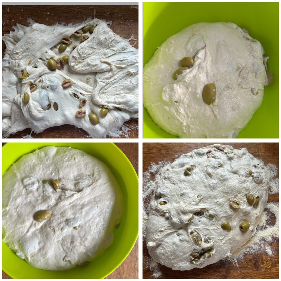 • Fold the dough over to enclose the olives inside the mass. Shape into a ball and place in a warm bowl until doubled in size. Depending on temperature, this can take two to three hours if it’s cold, or just one hour if it’s warm. When the dough has doubled, turn it out onto a floured surface and shape into a rough ball.