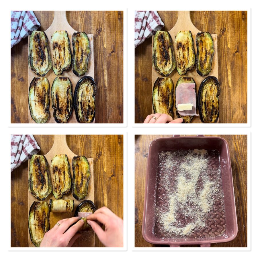 Gratinated oven-baked grilled eggplant rolls with cooked ham and cheese, an eggplant recipe that is easy, quick and delicious, perfect when these vegetables are in season — as good as savory baked eggplants or Mediterranean-style eggplant rolls or even my famous Grilled Eggplant Salad.