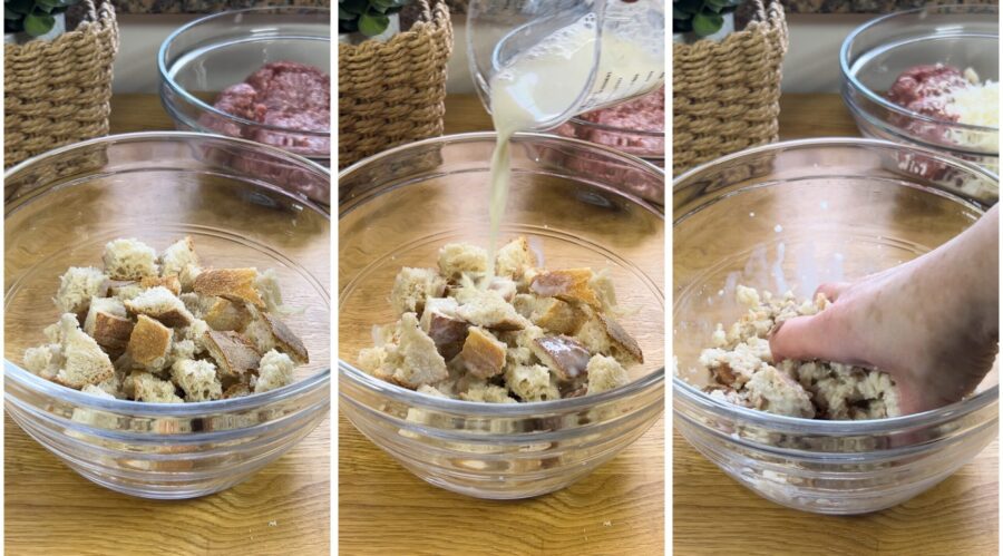Cut the stale bread and drizzle it with milk, let it absorb it all, then crumble it with your hands.