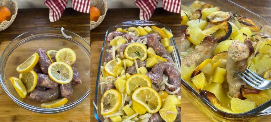 Oven-baked sausage with potatoes, onions and lemon, a delicious main course. Sausage can be cooked in a thousand ways and it is always delicious, breaded and fried in a pan, or in sauce on festive days, but also baked with potatoes or baked “alla boscaiola” or baked with potatoes and cardoncelli. In no time it solves dinner and makes everyone happy! A few days ago I wanted to try a slightly different and original recipe, so to the usual ingredients of oven-baked sausage with potatoes and onions I also added some lemon slices, obtaining a dish as simple as it is tasty!! Would you like to try it too? Then let’s go to the kitchen right away, I’m sure the oven-baked sausage with potatoes and onions, scented with lemon, will please you too, just as it pleased my family, who devoured it in no time!!