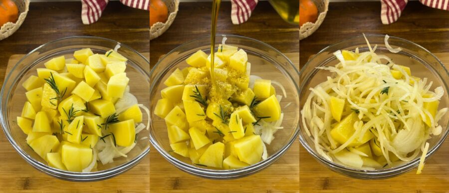 Gather everything in a large bowl, season with salt, add a good drizzle of oil, add grated lemon zest, pepper and fresh or dried rosemary. Mix well.