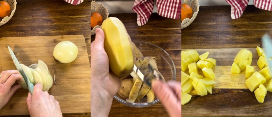 Peel and slice the onion, then peel, rinse and cut the potatoes into large chunks.