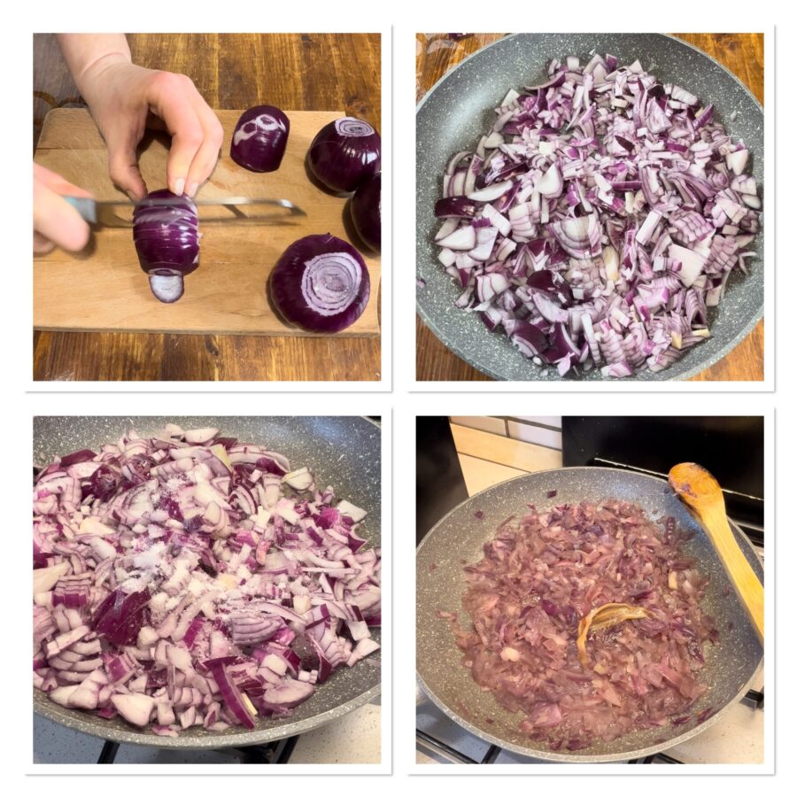 Peel and slice the onions; it’s preferable to use white onions or a variety that cooks quickly. I used red onions; they work well but are a bit darker than ideal.