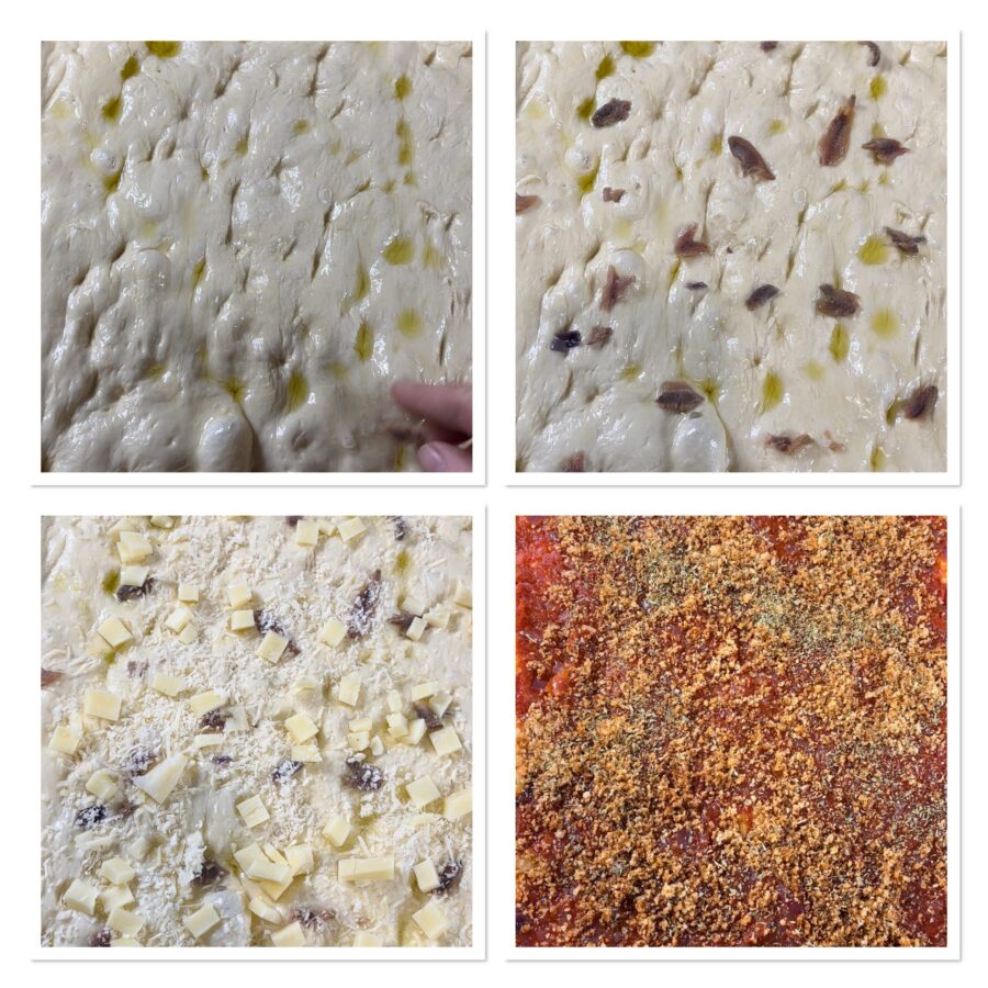 Spread a good drizzle of oil on the base of the sfincione, add the torn anchovy fillets, the caciocavallo cubes and the grated cheese.