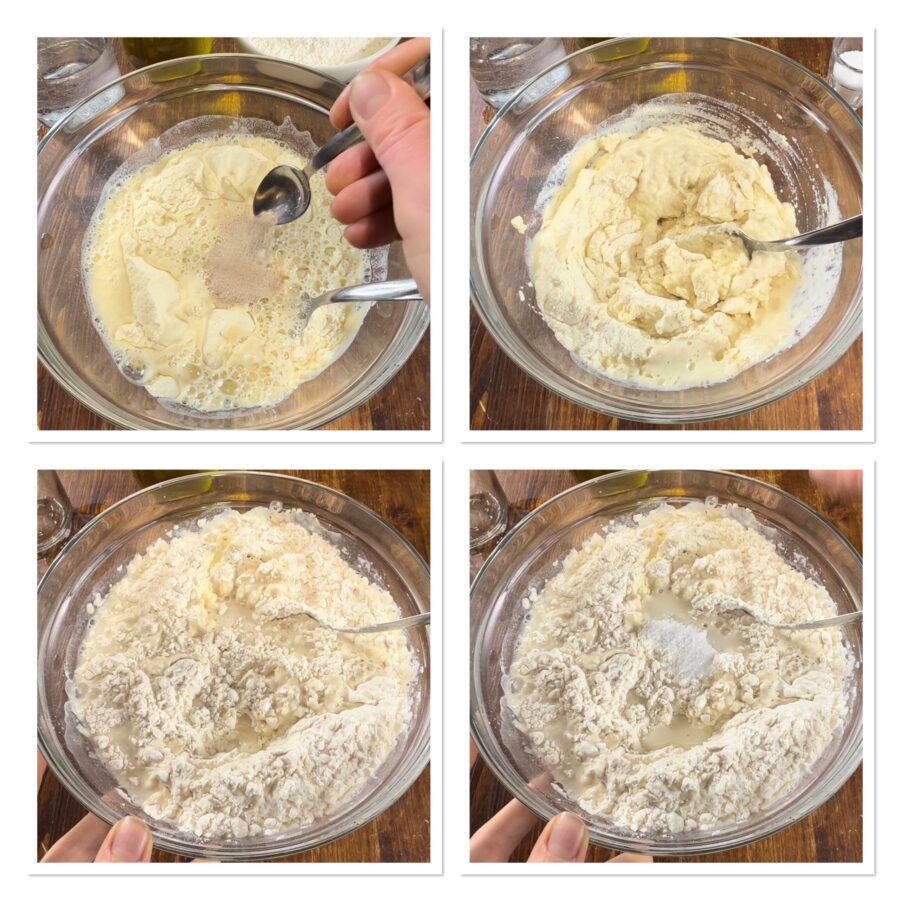 Gather the re-milled semolina in a bowl, add almost all the water, the sugar and the yeast, and mix. Then add the all-purpose flour (type 0), the olive oil (which can be substituted with lard), the salt and the remaining water. Combine everything with a spoon, cover with a cloth and let rest for 20 minutes.