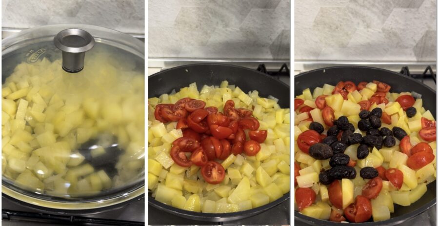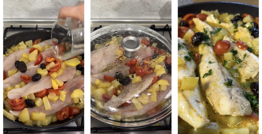 Cover the pan with its lid and cook for about ten minutes; thanks to the salt the potatoes will sweat and soften. After this time add the rinsed cherry tomatoes cut in halves or quarters and the olives. Stir, let them take on flavor, and lay the cod fillets over the other ingredients.