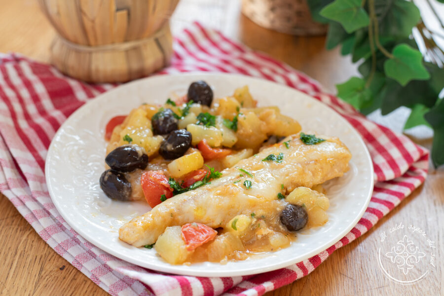 Pan-fried cod with potatoes, olives and cherry tomatoes: a tasty recipe for cooking frozen cod. We have already prepared the Merluzzo in umido con pomodorini or the Merluzzo surgelato in padella con pomodorini e olive, but have you ever tried adding potatoes too? Trust us, it’s delicious! Cod with potatoes, cherry tomatoes and olives is a delightful fish main course, economical, easy, tasty and quick to prepare, which will solve dinner with an affordable expense. A perfect dish when you have little time or you’ve bought frozen cod and don’t know how to prepare it. Ready to run to the kitchen? Let’s go, but before discovering our flavorful recipe with frozen cod, I remind you that if you want to stay updated on new recipes you can follow my Facebook page (here) and my Instagram profile (here).