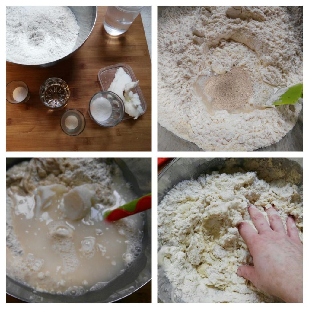 Put the flours in a bowl, make a well and add the yeast (you can also use fresh brewer’s yeast): pour a little liquid and dissolve it. Add the rest of the ingredients and knead for ten minutes, until you obtain a well combined dough.