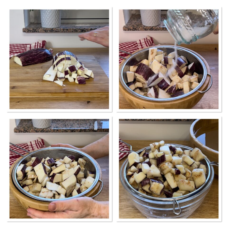 • Rinse the eggplants and decide whether to peel them or not. Cut them into cubes or slices, place them in a bowl, sprinkle with a handful of salt and let rest for 30 minutes. Rinse, squeeze and pat dry with a kitchen cloth.