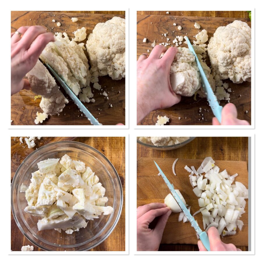 I used a white cauliflower, but you can use the type of cauliflower you prefer. If it’s dense and compact you can simply rinse it whole; otherwise separate the florets and rinse them individually, then let drain. Either way, cut the cauliflower into small pieces and collect them in a large glass or ceramic bowl.