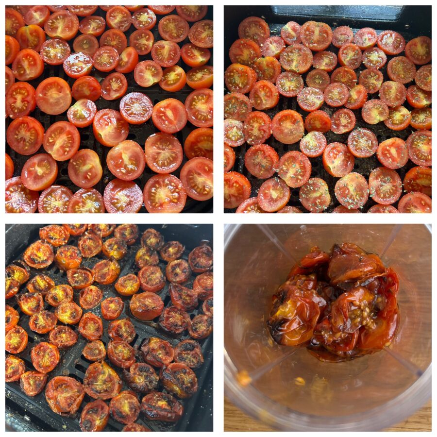Start by preparing the cherry tomato confit: rinse them and cut them in half, then arrange them neatly on the rack of the air fryer (mine is 6 liters).