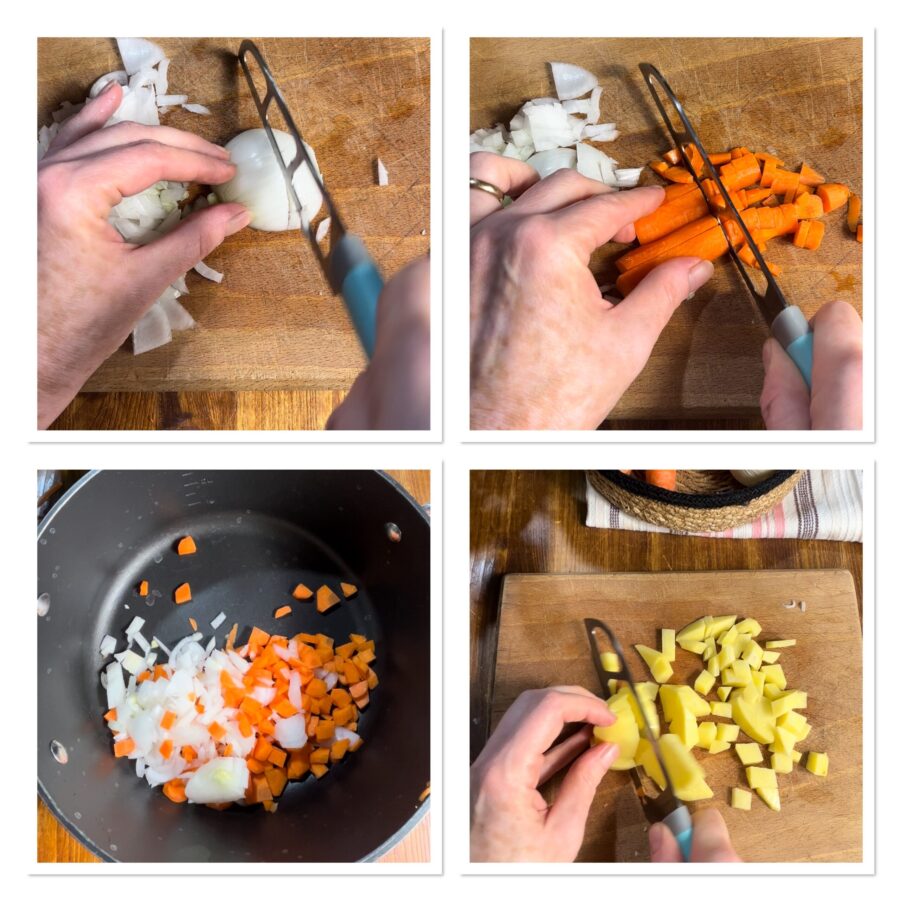 • To make the Sicilian-style pasta soup with potatoes and peas, start by peeling the potatoes, the onion and the carrots.