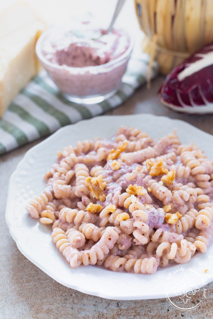 Pasta with radicchio, pancetta and walnuts cream, radicchio and walnut pesto pasta is an irresistible first course, quick, tasty, colorful and very easy to prepare, just like Pasta with basil and walnut pesto or Pasta with broccoli and walnut pesto and suitable for the whole family.