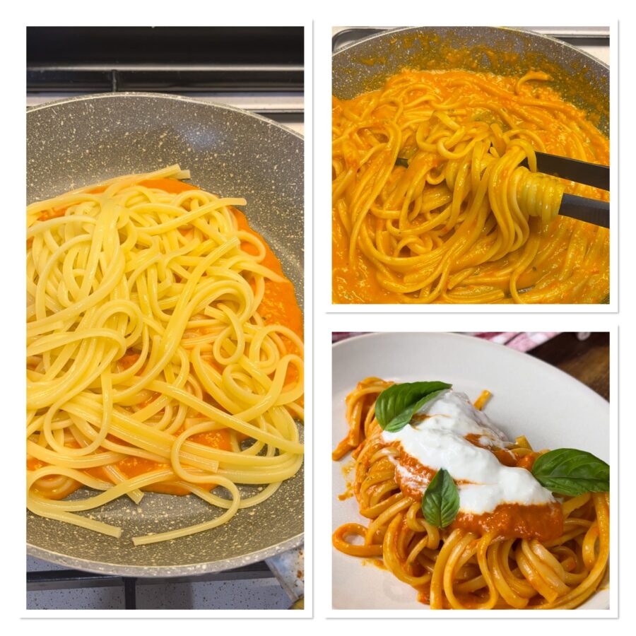 Pour the sauce into a large skillet, add the cooked and drained pasta (al dente) and toss to combine, continuing the preparation by adding a little (of the pasta cooking water) only if needed.