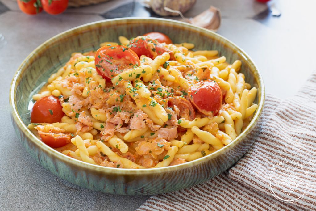 Creamy pasta with smoked salmon and cherry tomatoes, without cream, quick to make and delicious. I love recipes with smoked salmon, it has always been my passion. Whether it’s a smoked salmon mousse, a cold pasta with zucchini and salmon or simple zucchini rolls with robiola and salmon, I really can’t say no to smoked salmon! A few days ago I found it on sale at the supermarket so I decided to stock up. With some packages I made Avocado toast with smoked salmon and country bread and a omelette roll with salmon and arugula, then I thought of making a quick summer pasta. For this delicious dish I decided to use a fresh pasta shape and, in particular, the trofie, whose texture I adore, but you can choose the shape you prefer. To make the pasta creamier and more delicate I added robiola, but you can replace it with cream, spreadable cheese, mascarpone or even use no cheese at all and simply toss with cooking water — after all, the fresh cherry tomato sauce is already quite creamy on its own.