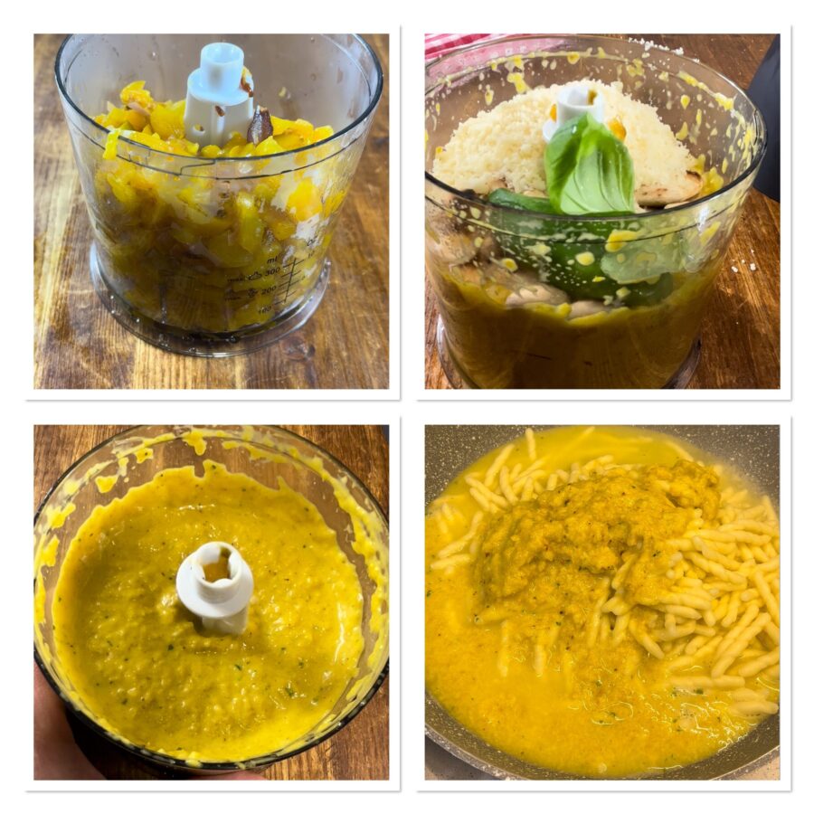 Blend the yellow peppers with the Parmigiano, a good drizzle of oil, the almonds and the basil.