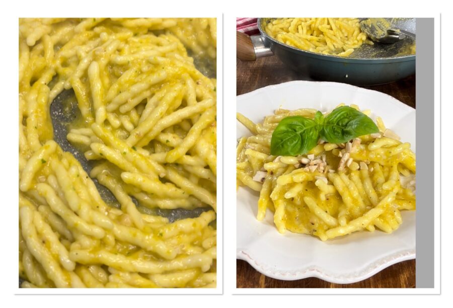 Add the trofie to the skillet where you cooked the peppers, add the cream and two ladles of pasta cooking water, and toss over high heat until you obtain a very creamy dish.