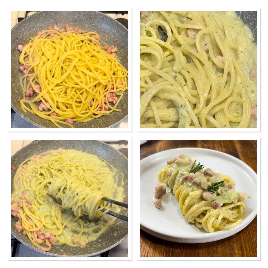 Drain the pasta al dente and pour it into the skillet where the pancetta is browning, add the cream, some of the pasta cooking water and combine, finishing by tossing everything together (you should achieve a very creamy dish, so if needed don’t skimp on the pasta cooking water).