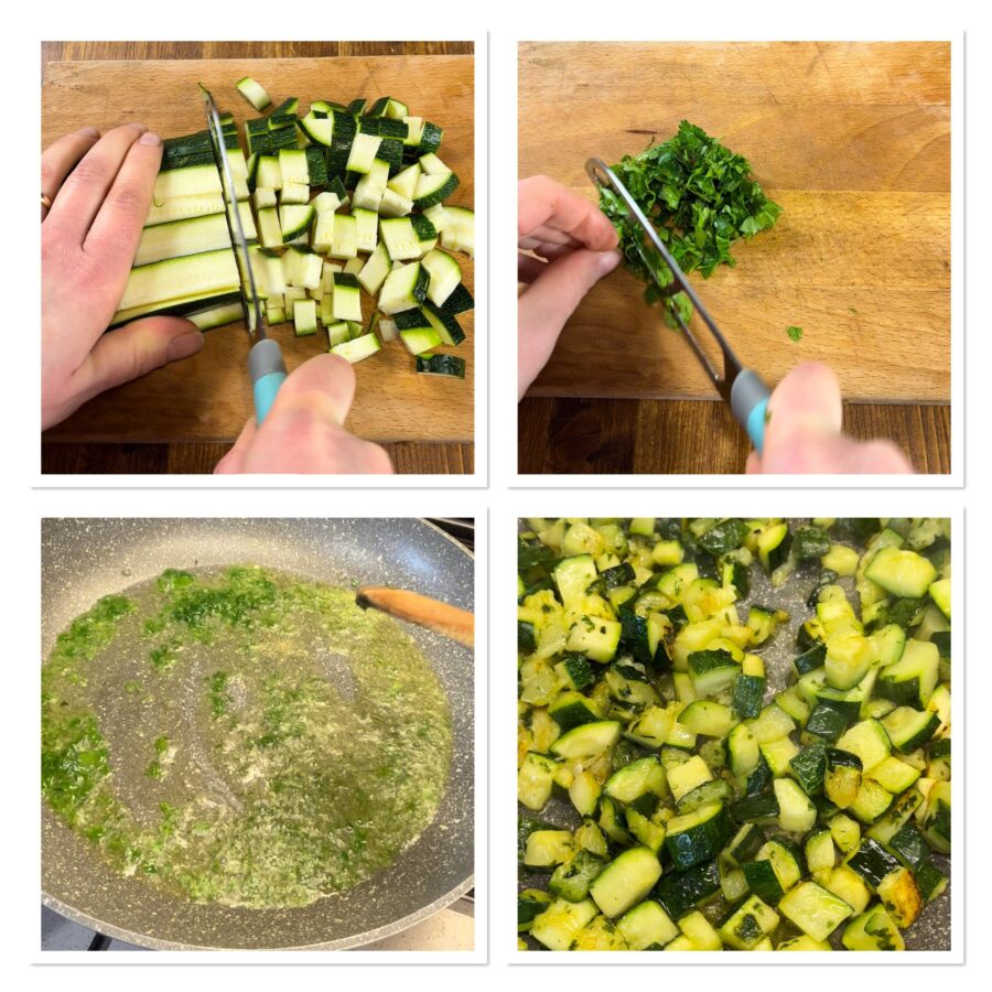 Start by putting the water on to boil for the pasta, then prepare the sauce. Rinse the zucchini, trim the ends and cut them into small cubes. Finely chop the parsley, collect it in a large skillet together with the garlic (I use powdered garlic for convenience), add a drizzle of oil and sauté. Add the zucchini, season with salt and cook over high heat until they are well browned.
