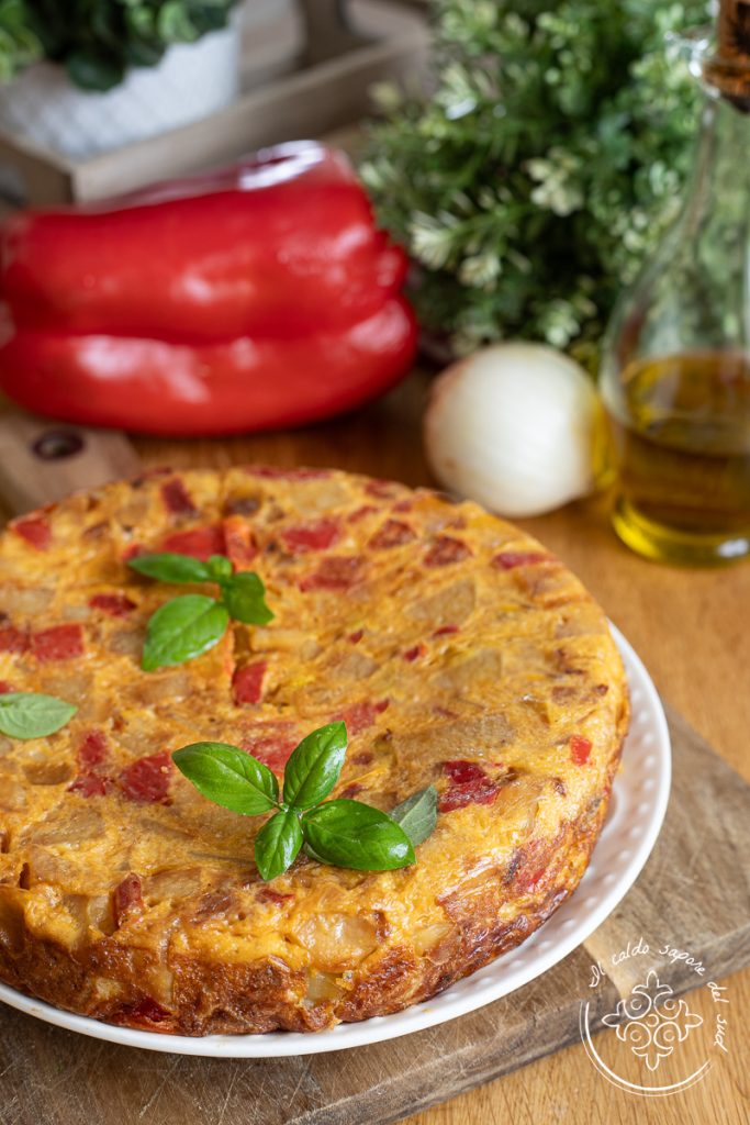 Thick frittata with bell peppers and potatoes, a simple and tasty summer main course perfect to prepare in advance. There are many ingredients that can make a frittata delicious: from zucchini and artichokes to, of course, potatoes and onions and much more. For us Italians, the frittata is one of those classic traditional dishes that always disappears quickly. In this version of a frittata with peppers I also added potatoes to make it richer, heartier and more flavorful, like a true savory skillet pie with peppers. The potato and pepper frittata is a dish perfect to serve hot, but it is also great cold or at room temperature, ideal for a shared aperitif and tasty as an appetizer when cut into squares. Let’s go to the kitchen — I’m sure this delight will win you over. As always, before we start cooking, a reminder: if you want to stay updated on all my recipes, you can follow my Facebook page (here) and my Instagram profile (here).