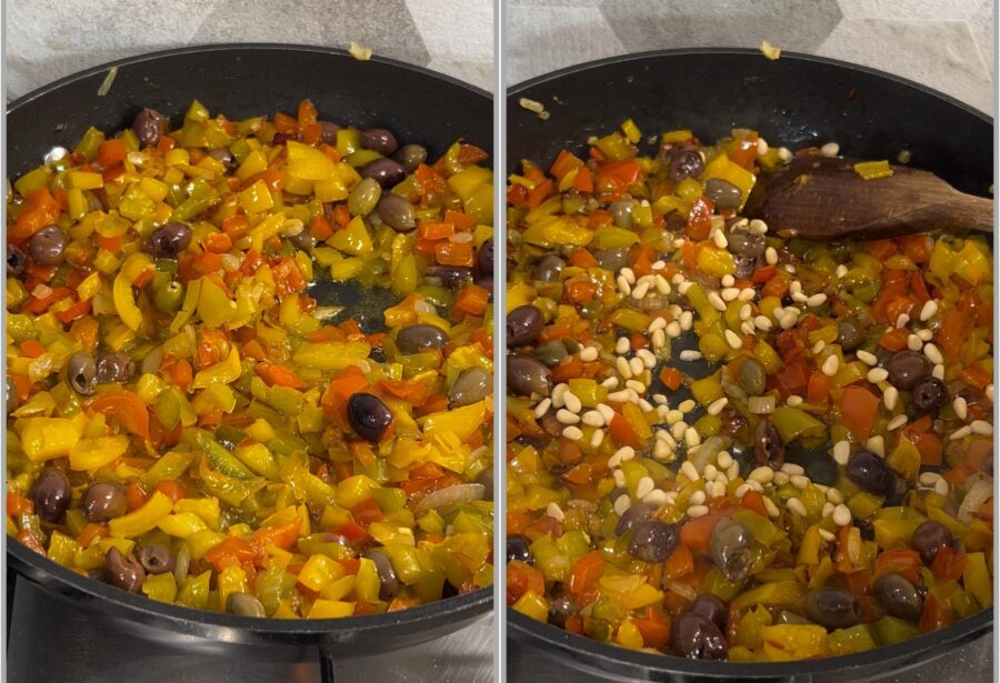 Pan-fried peppers with olives, capers and pine nuts, a tasty vegetarian side dish and a delightful appetizer perfect for summer. You may have already enjoyed our roundup dedicated to the 10 best side dishes with peppers and surely loved the classic and timeless Sicilian roasted pepper salad. There are certainly many easy recipes with peppers, from first courses with peppers to main courses like Sicilian-style stuffed and gratinéed pepper rolls. Just keep this wonderful summer vegetable in the fridge and you can create something delicious. This time, with the peppers I thought of making a flavorful and versatile side dish, also perfect to dress a good pasta dish. A dish you can prepare in the morning or evening and enjoy later after the beach, at the office or after a day out—and even on the following days. Are you ready to discover how to make pan-fried peppers with olives? Let’s go to the kitchen, but as always before we start cooking I remind you that if you want to stay updated on my recipes you can follow my  Facebook page and my Instagram profile .