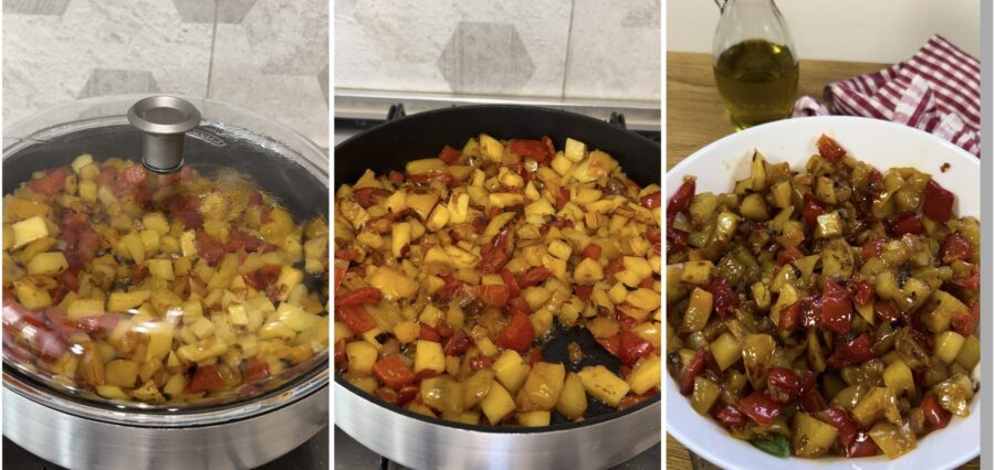 Sauté the onion in olive oil, add the peppers, season with salt and let them simmer over medium heat for 20 minutes, stirring often.
