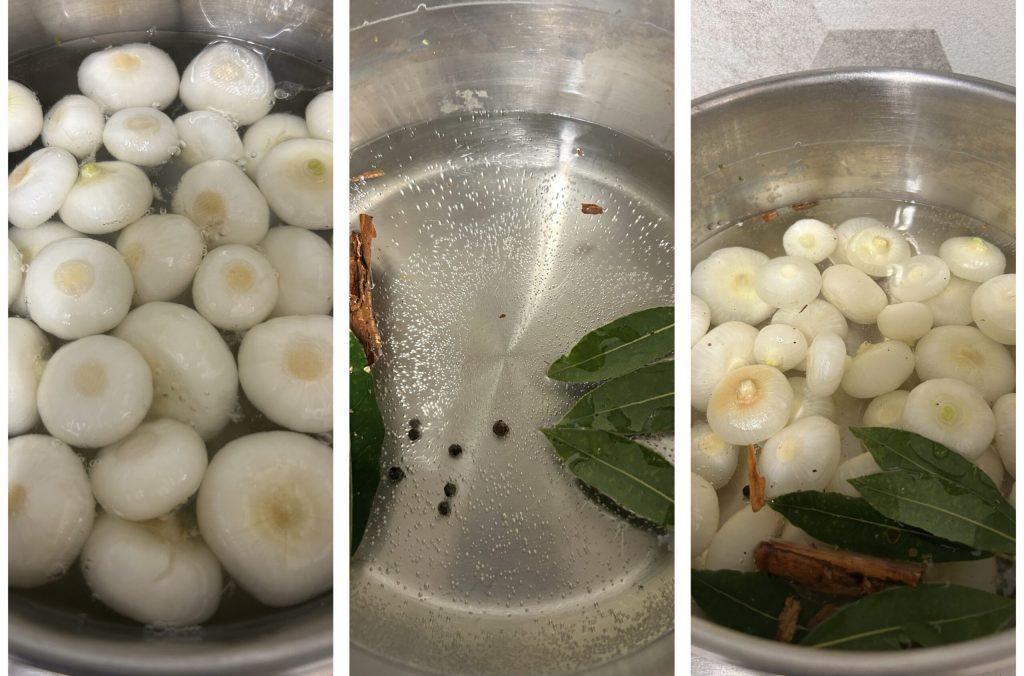 Collect the onions in a bowl full of cold water. Meanwhile, bring to a boil a pot with 2 cups (500 ml) of white wine vinegar, 1 cup (250 ml) of water, the salt (about 1 teaspoon) and all the aromatics. Immerse the onions and blanch them for 7–8 minutes, or 10 minutes if they are slightly larger.