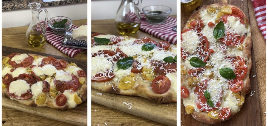 Pinsa with cherry tomatoes and mozzarella should be eaten immediately; leftovers can be refrigerated for 24 hours and reheated if needed, but they will never be as good as when freshly made.
