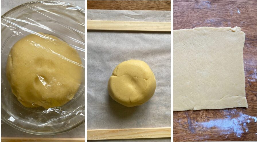 • After about 30–40 minutes, take the doughs out of the refrigerator. Start by rolling the white half into a rectangle about 1/8 inch (3 mm) thick.