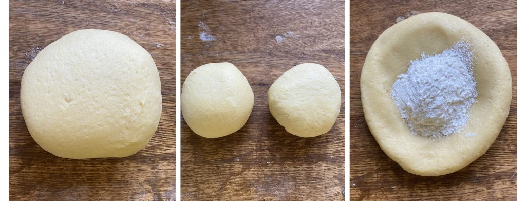 • The resulting dough should be fairly homogeneous and workable. Divide it into two, making sure to weigh the two halves correctly. To one of them add the remaining 1/4 cup (about 30 g) of flour; this will be the white half.