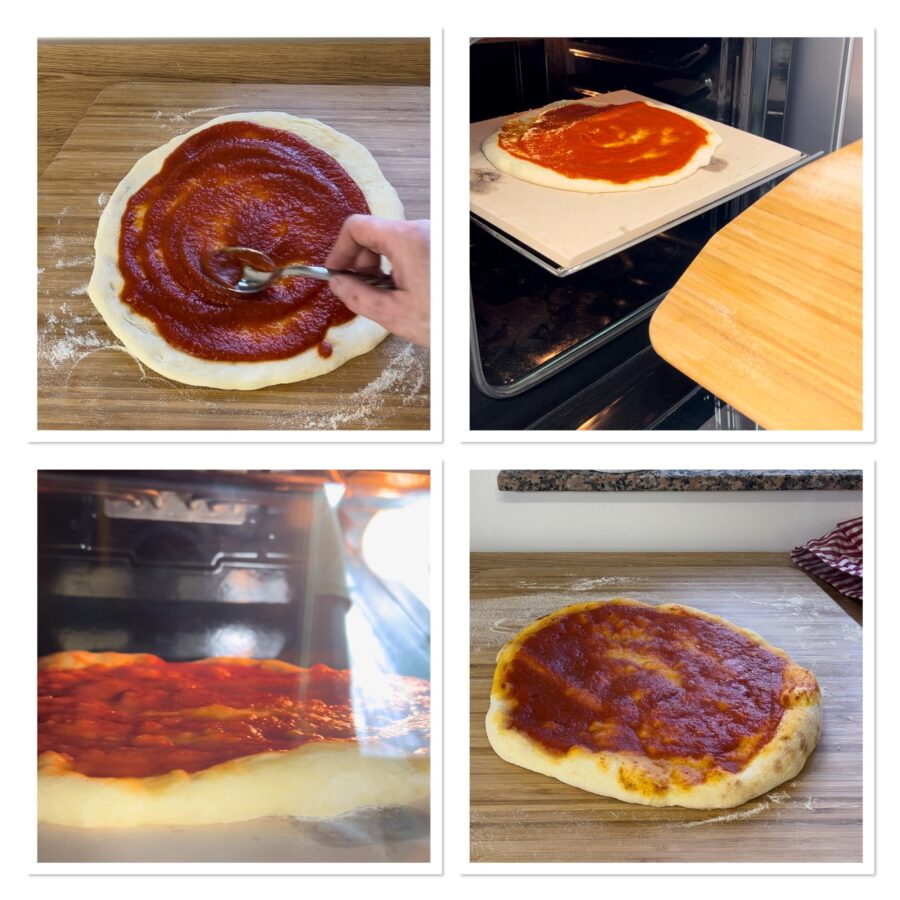 • Spread the tomato sauce, preferably homemade. Without wasting time and before the sauce wets the dough too much, slide the pizza onto the stone. Open the oven, pull the rack out halfway where the stone is resting and let the pizza slide onto it. Put the rack back and bake under the grill for about 7 minutes, but check the cooking as not all ovens are the same.