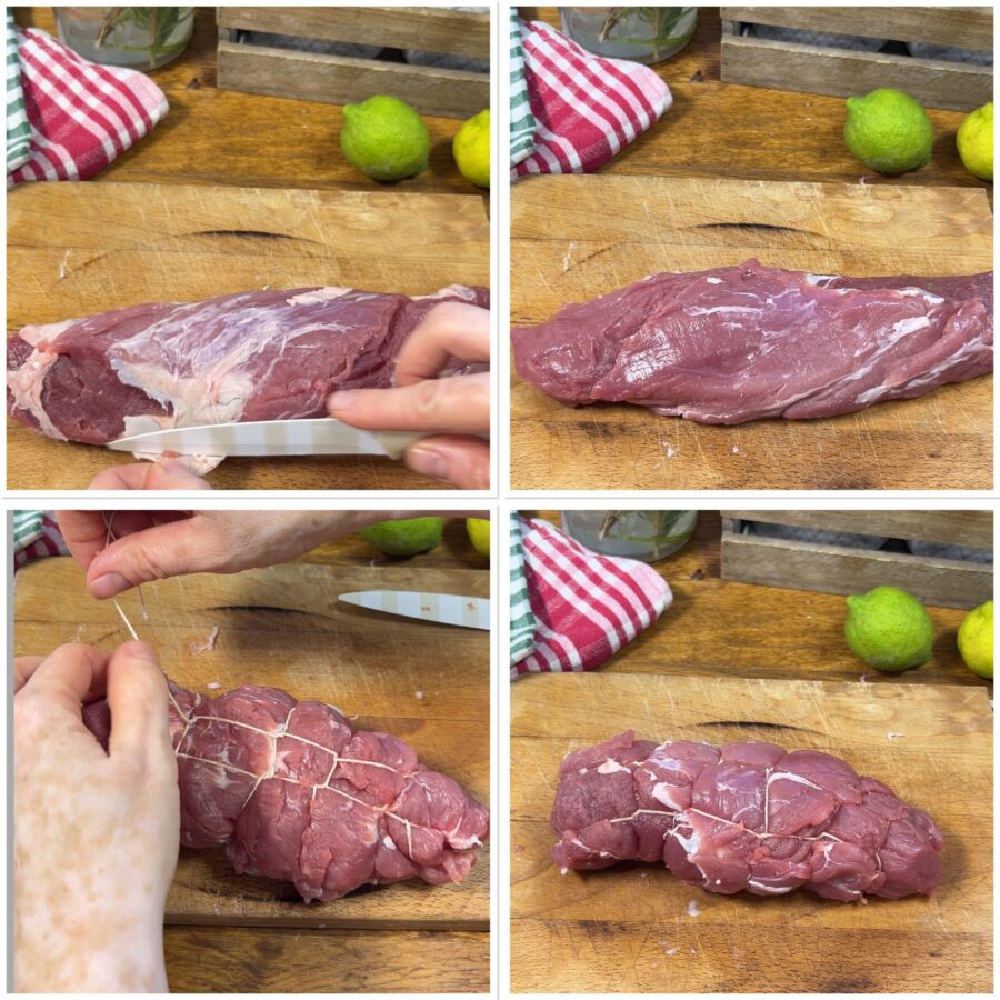 Even before starting to cook the tenderloin, you can do the potatoes. Once cooked (you could also simply boil them for 35 minutes or until soft — do the skewer test to check tenderness), mash them and season with a pinch of salt, butter, pepper and nutmeg, mixing well. Unroll a sheet of parchment paper, spread a layer of mashed potatoes evenly and arrange the slices of guanciale or pancetta in a lattice on top.