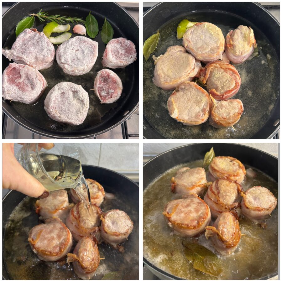 Collect garlic, bay leaves, rosemary and oil in a pan. Place the medallions and cook two minutes per side, turning carefully so as not to pierce the meat.