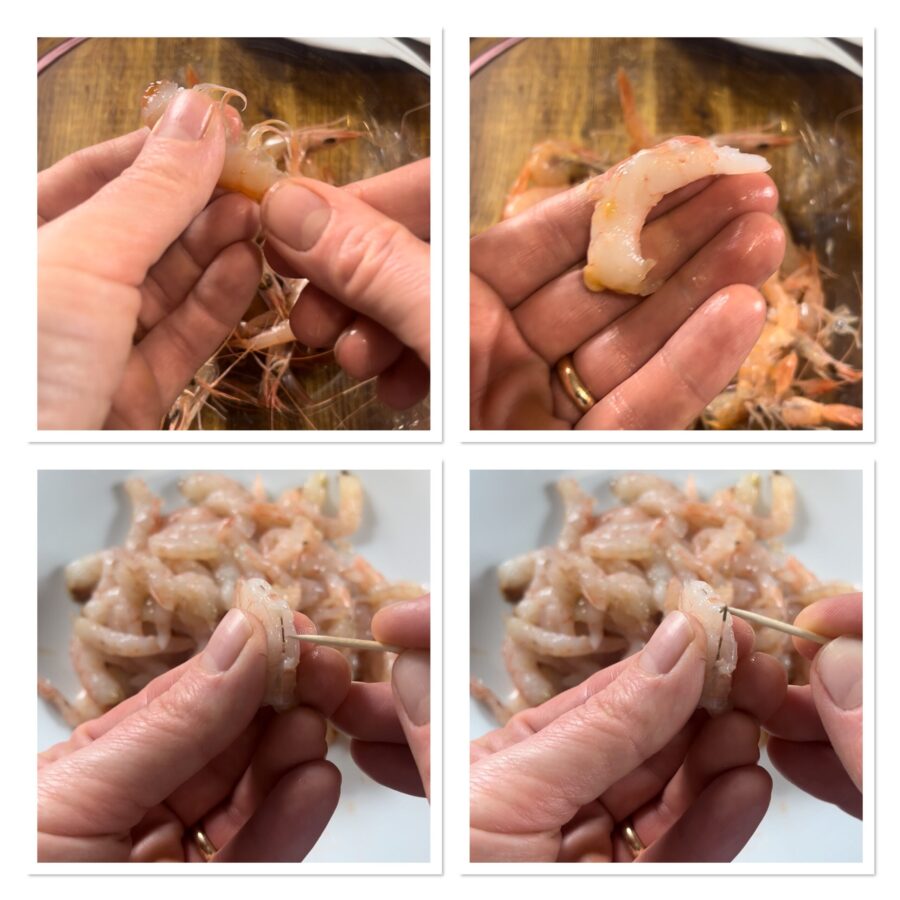 While the potatoes are cooling, shell the shrimp by removing the head, then the shell and finally the digestive tract with the help of a toothpick.