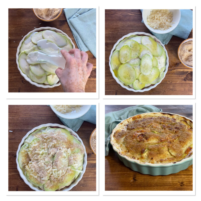 • Top with a final layer of zucchini and pour in one cup of milk — this will help the cooking.