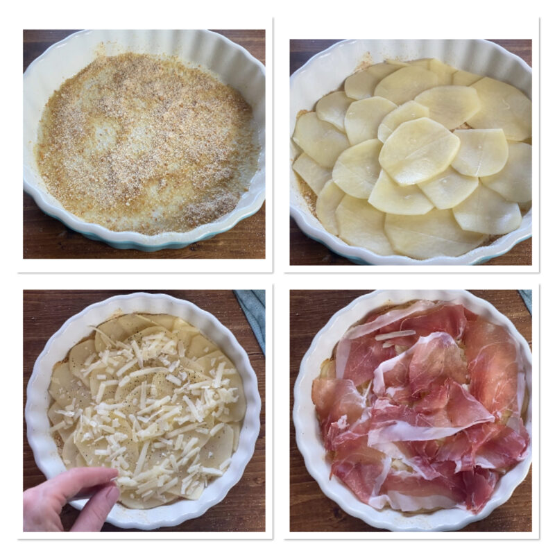 • Grease a baking dish with a drizzle of olive oil, sprinkle with breadcrumbs and make a first layer of potatoes. Sprinkle breadcrumbs, grated cheese and pepper, then add speck and sliced cheese.