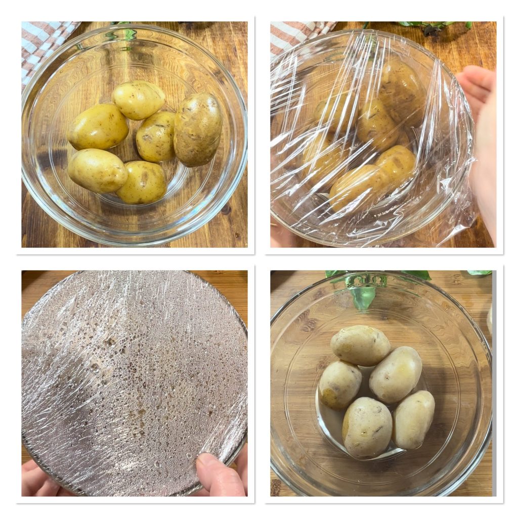 Cook the potatoes. You can boil them in a pot of cold water for about 30-35 minutes — they are done when a skewer slides in easily. For a more practical method, rinse the potatoes, place them in a glass bowl, add half a glass of water and cover with plastic wrap. Microwave for 20 minutes at 750W. Let rest a few minutes and they will be ready.