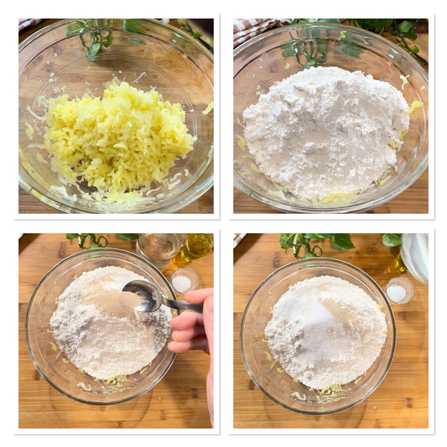 Peel and mash the potatoes while still hot but not boiling. Put them in a bowl and add the flour. Add the yeast, sugar, a little water and mix.