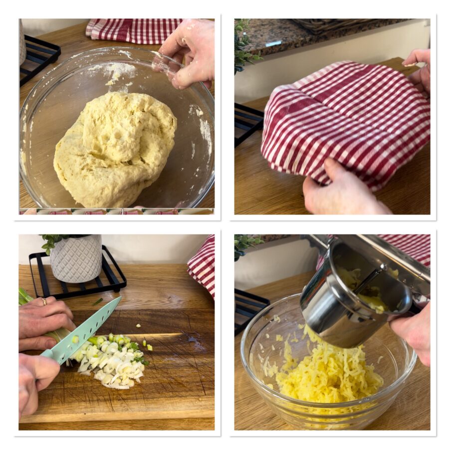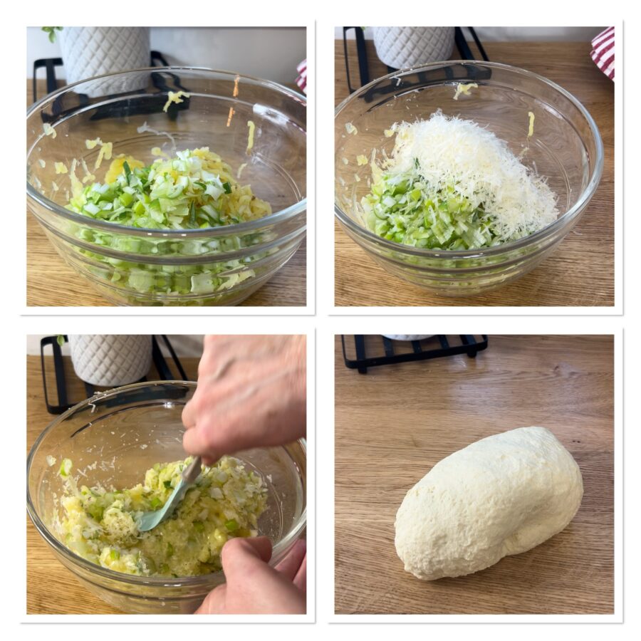 I chose a filling of potatoes, scallions and cheese, but apart from the potatoes you must use, you can substitute the other two ingredients however you like — for example with sautéed or grilled vegetables or different sliced cured meats.