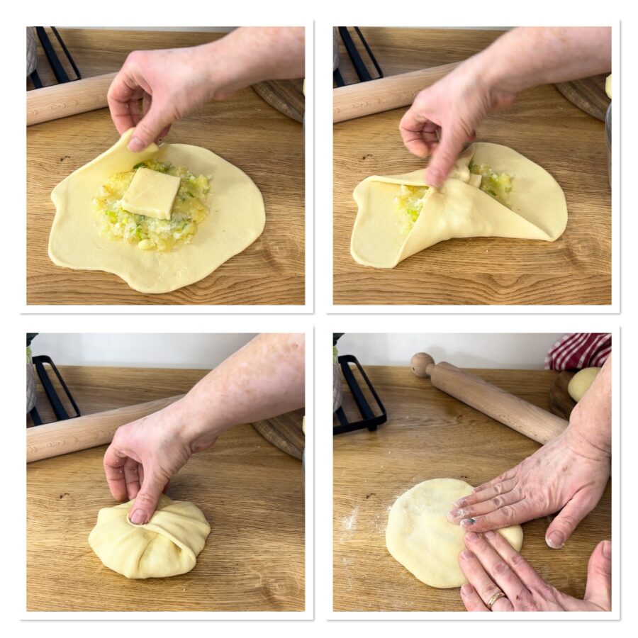 Flatten each ball with a rolling pin or with your hands to form a disc, fill it with the mashed potatoes and cheese, fold into a packet bringing the edges toward the center.