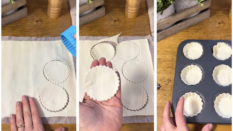 Unroll the puff pastry and, using a 4-inch round cutter, cut circles. Place the circles into the molds and then place a second circle on top of each one.
