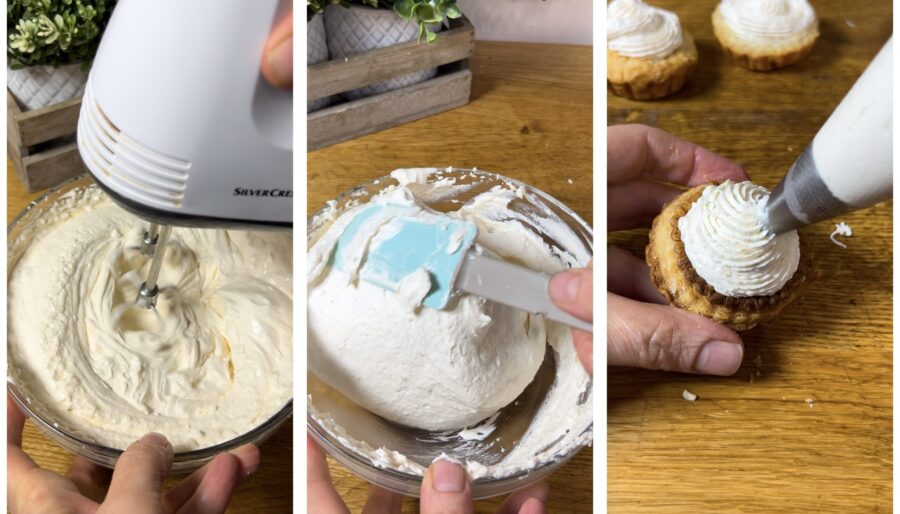Add the mascarpone, the juice of the second lemon and season with salt. Whip until you obtain a light, fluffy mixture — thanks to the lemon juice the mixture will gain body. Fill a piping bag with the mixture and pipe into the baskets.