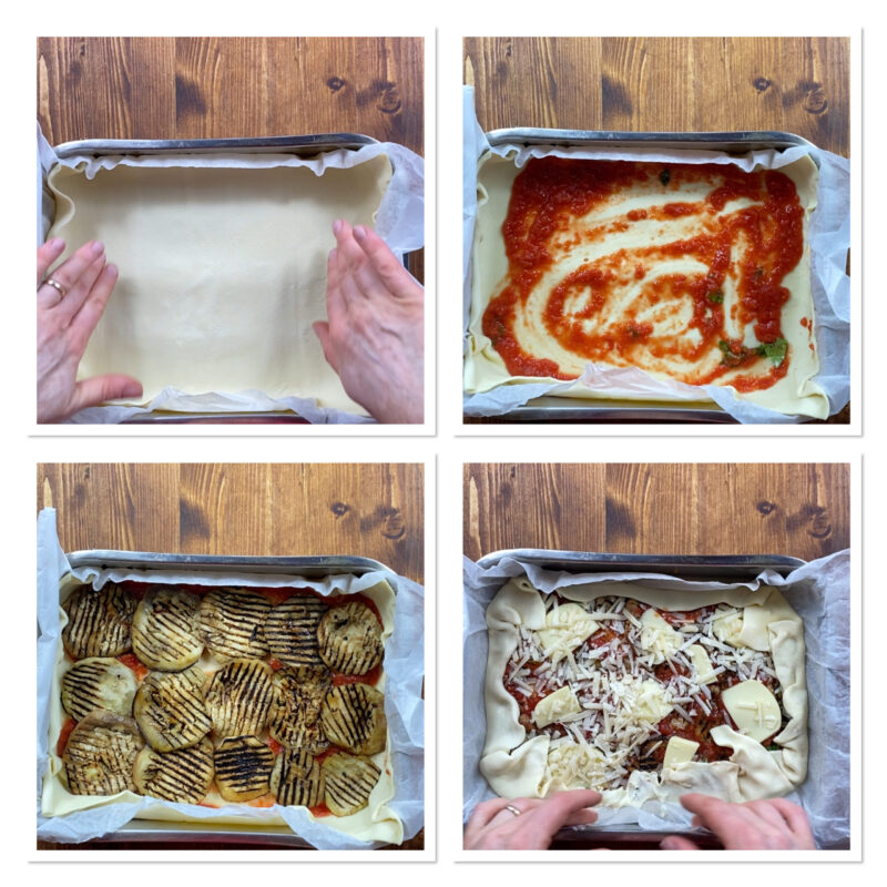 Puff pastry with grilled eggplant, tomato and mozzarella, a quick savory made with puff pastry.