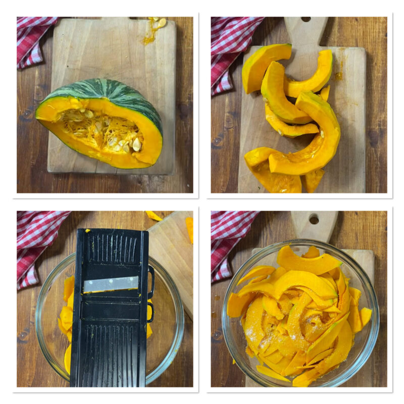 Peel the pumpkin, remove the seeds and fibers and slice it with a mandoline, season with salt and pepper, drizzle with oil and mix.