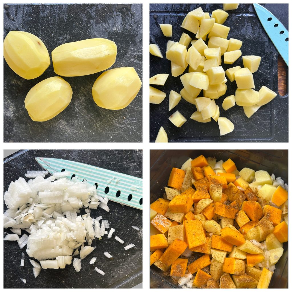 To make the pumpkin and potato frittata, rinse the pumpkin, peel it and cut it into small cubes.