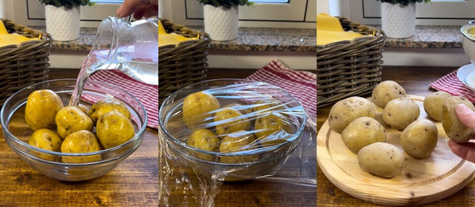 Place the potatoes in a pot, cover with water, add salt and cook for 35-40 minutes from boiling or until they are soft when pierced with a skewer. Drain them and let them cool slightly. Or do as I do: place them in a bowl after washing, add half a glass of water and cover tightly with plastic wrap. Cook in the microwave at 750W for 20 minutes, then remove and let cool slightly.