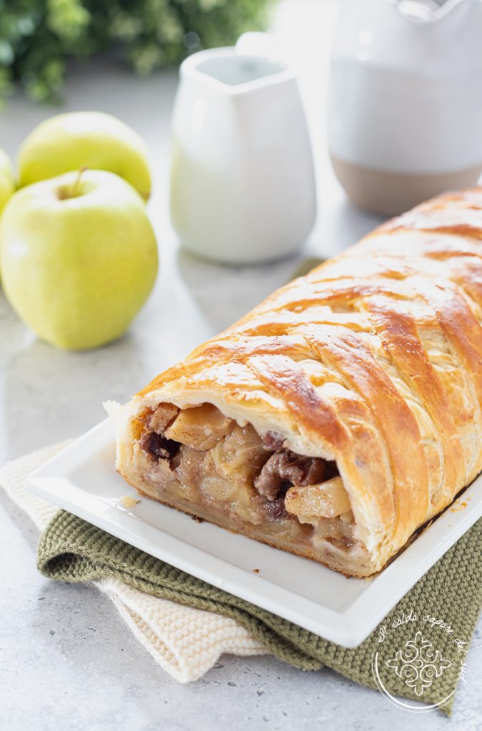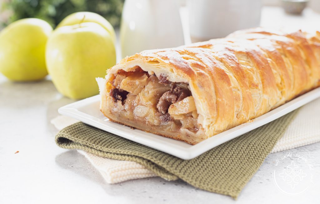 The puff pastry apple strudel encloses a soft filling of apples, cinnamon and raisins wrapped in a crispy, golden shell. A practical alternative to the traditional apple strudel — we have also prepared it with ready-made pâte brisée — perfect served warm as an afternoon snack or as a dessert.