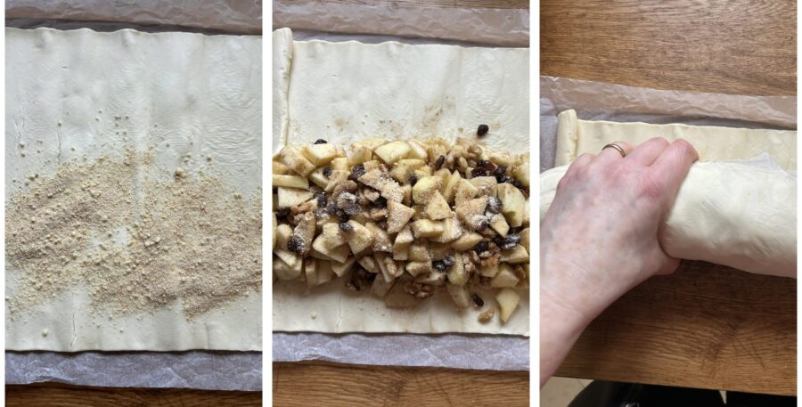 sprinkle breadcrumbs over it (they will absorb the apples’ moisture), and spread the apples along the long side. Scatter a little more breadcrumbs and roll into a cylinder